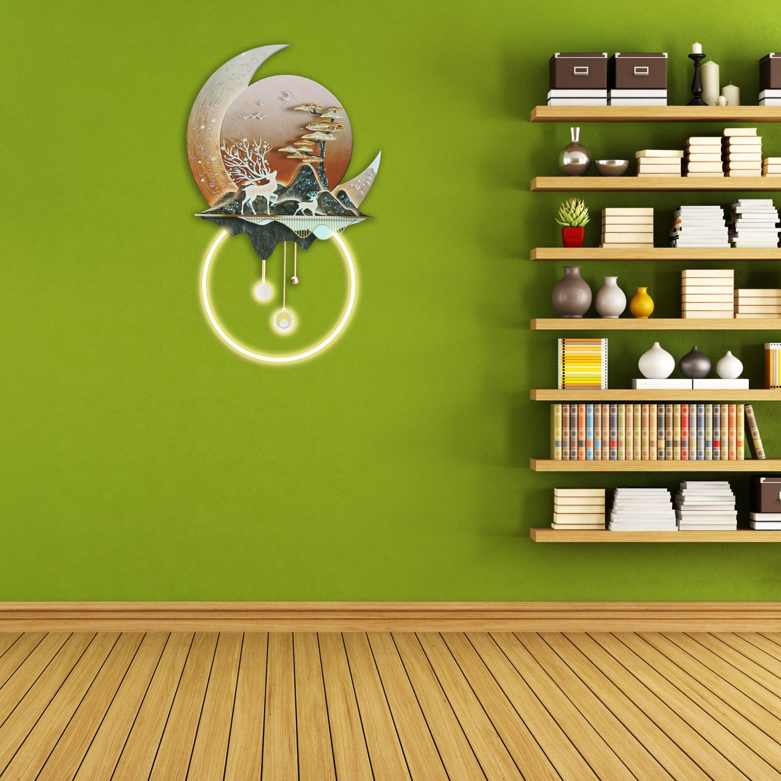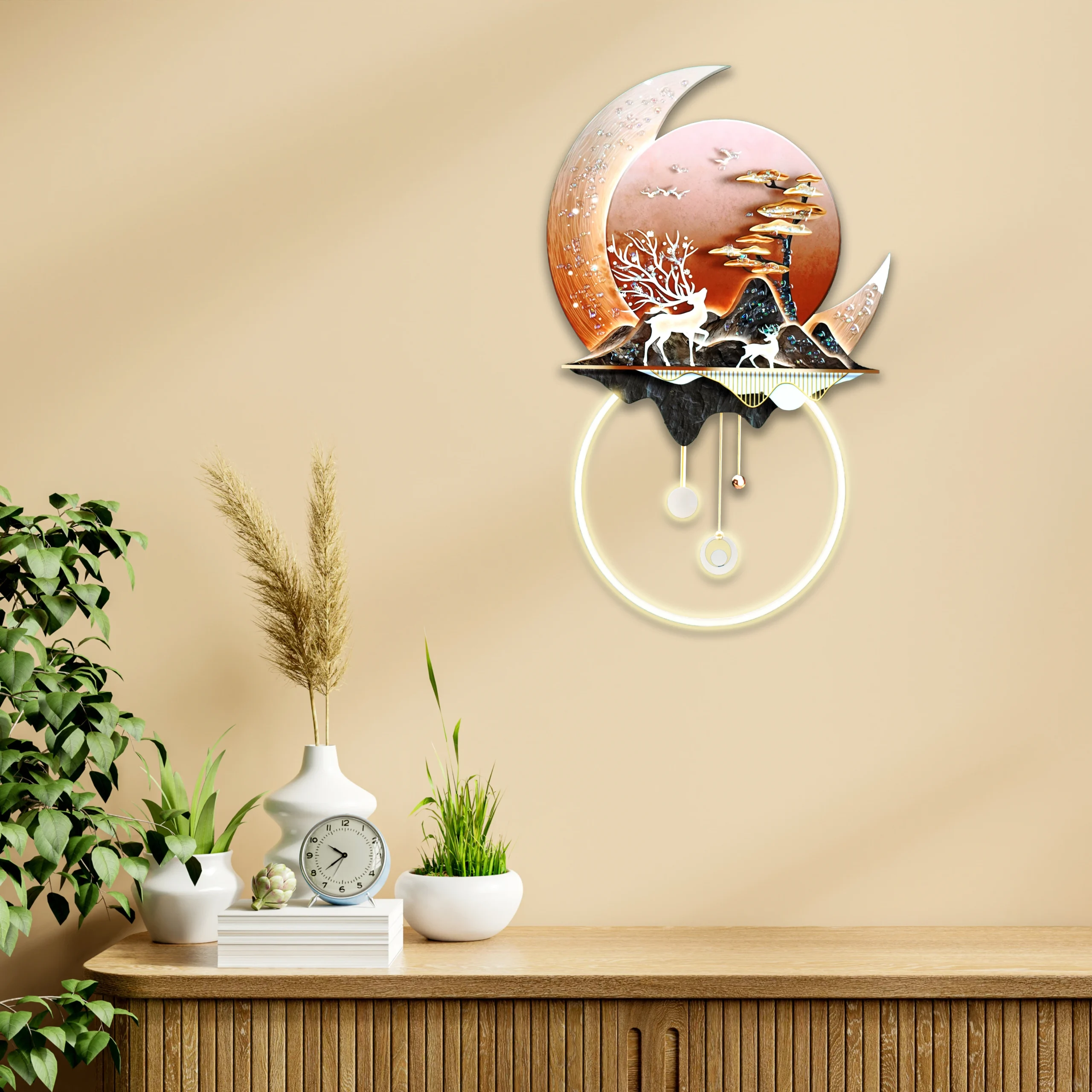 Infuse your space with a unique fusion of nature and celestial artistry through this contemporary wall decor. The composition features a stunning landscape of white deer, golden trees, and dark mountains under a crescent moon — all set against warm copper, deep black, muted gold, and creamy white tones that create a bold and serene presence.