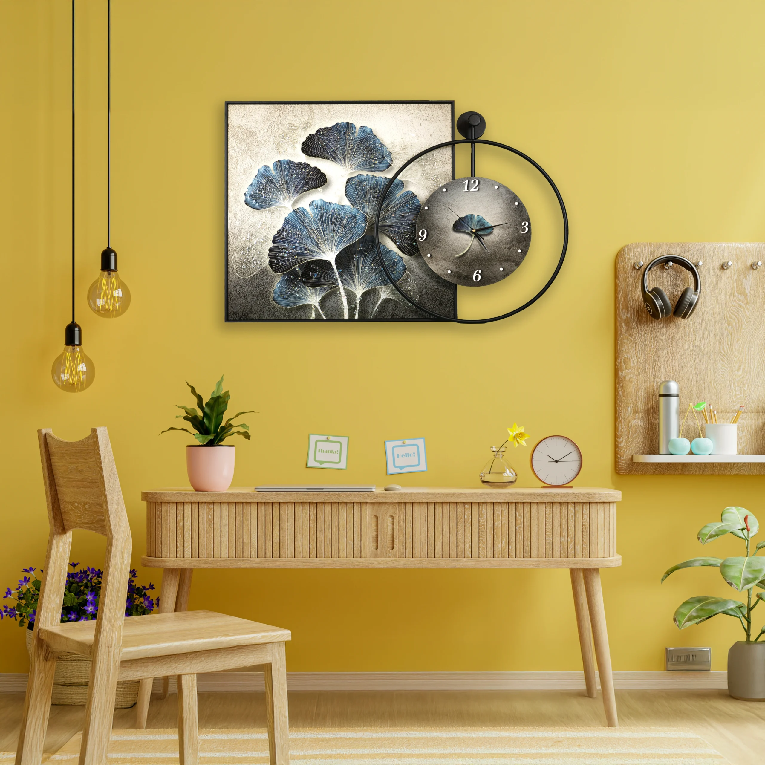 This unique design showcases a serene botanical theme with textured blue floral leaves, set against a soft gradient background, complemented by a sleek circular clock on the right. The mix of deep navy blue, soft beige, metallic grey, and matte black gives it a balanced, contemporary feel that suits both modern and classic interiors.