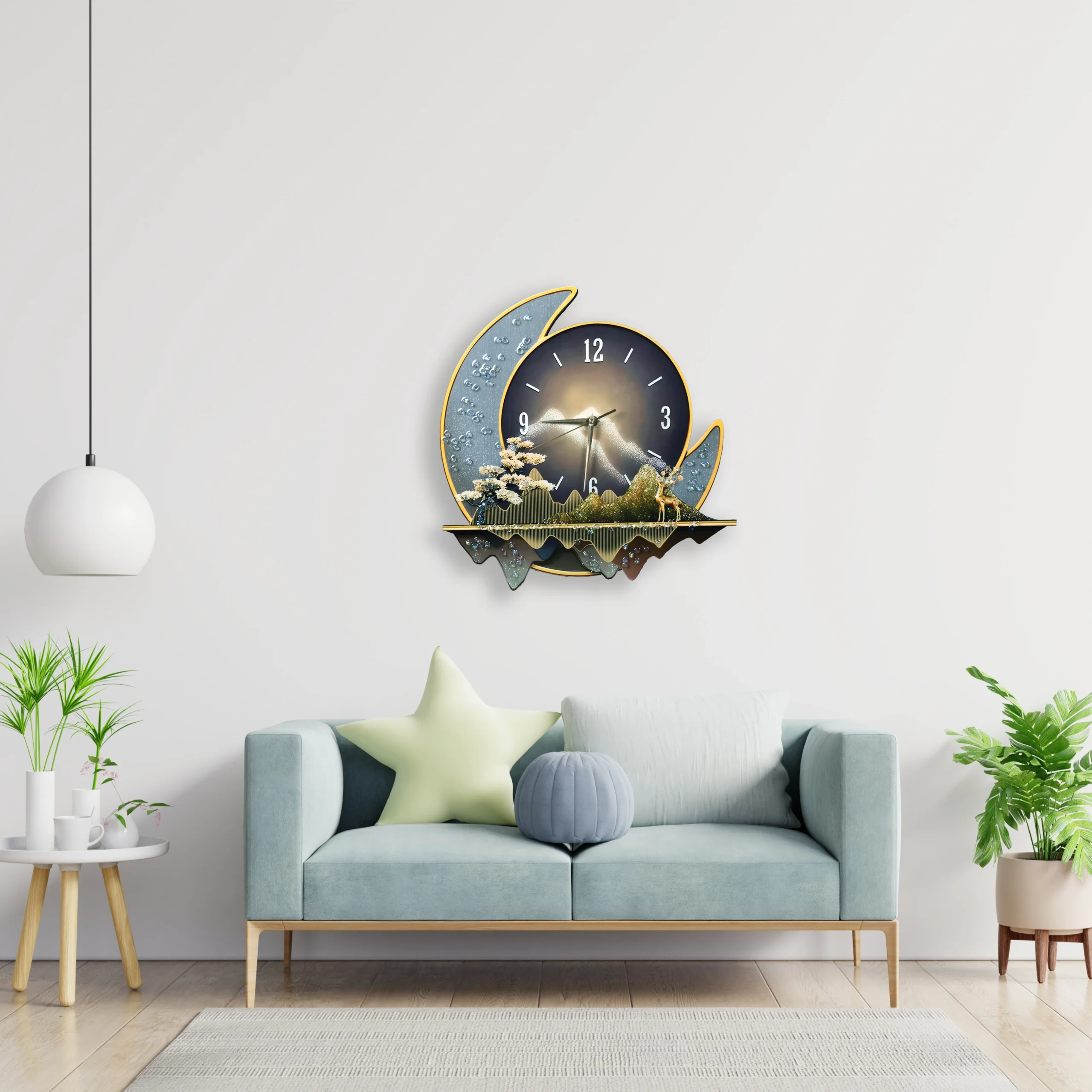 Elevate your living space with the stunning Golden Dusk Mountain & Deer Wall Clock, where art meets modern elegance. This premium home décor piece is masterfully crafted using durable aluminum, porcelain inlaid with diamonds, and a sleek acrylic finish, all enhanced by the glow of warm LED lighting. The design depicts a tranquil mountain landscape under a crescent moon, with a golden deer and blossoming tree evoking natural beauty and balance.