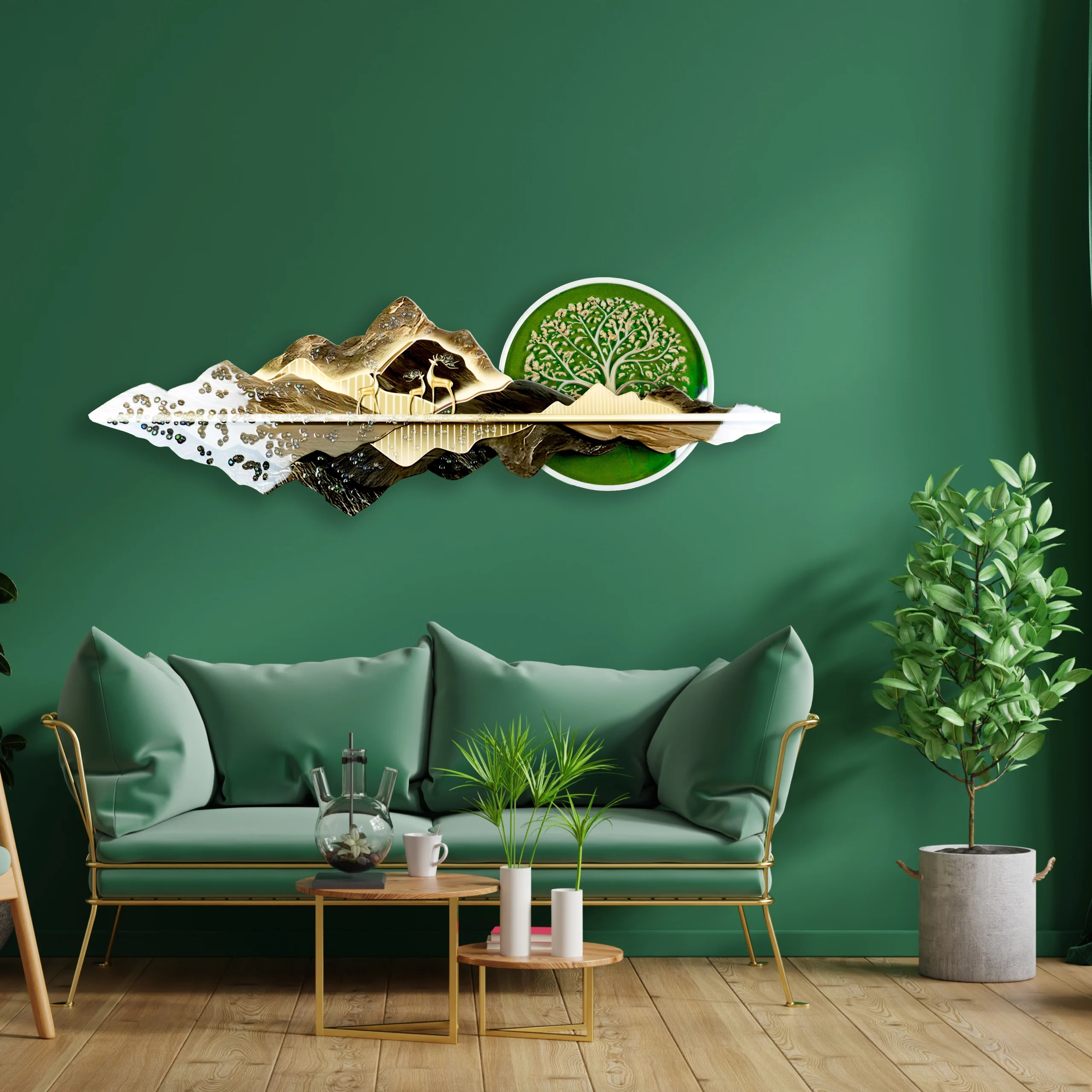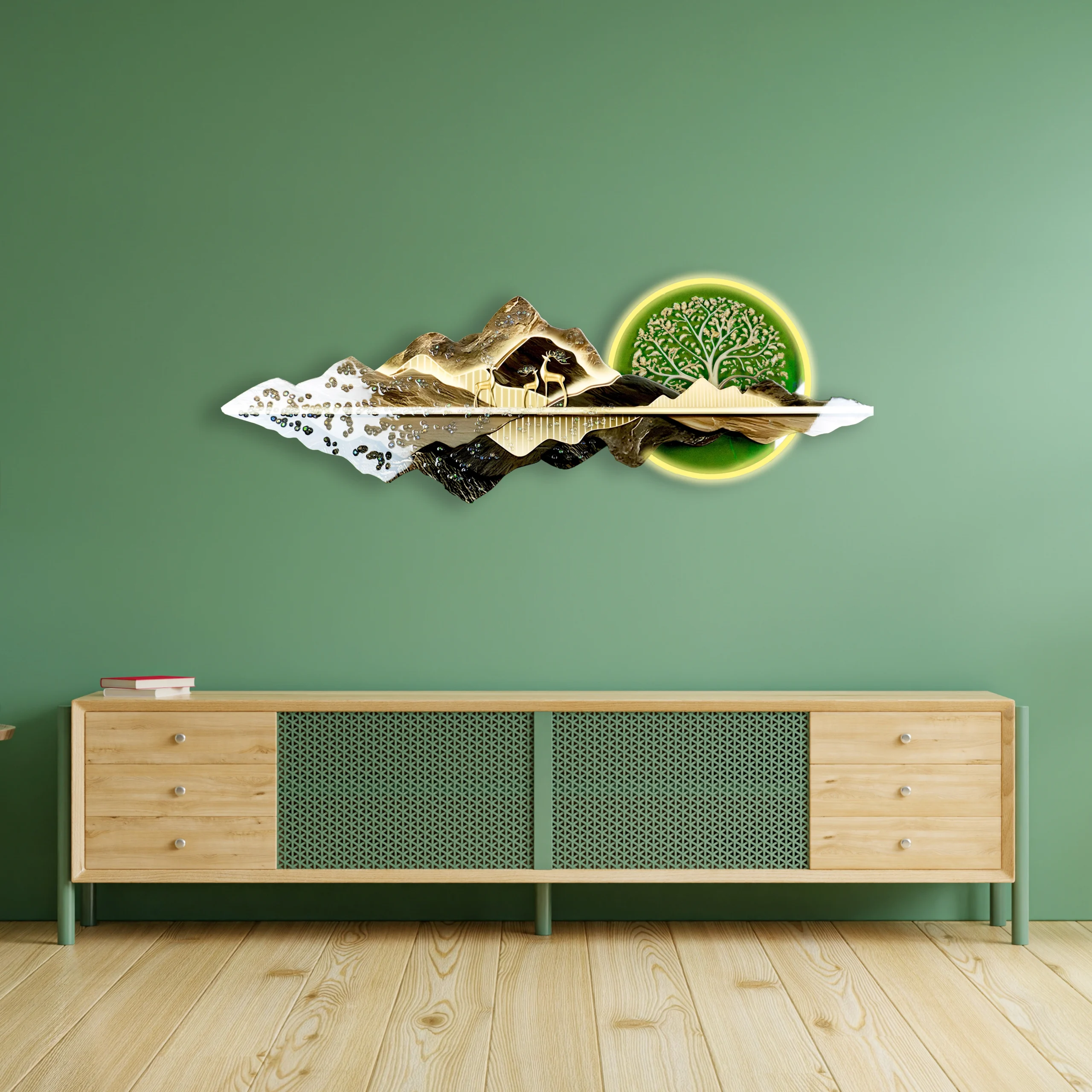 Transform your living space with the serene elegance of our Golden Horizon LED Wall Art, a harmonious blend of nature-inspired design and modern craftsmanship. This panoramic wall piece showcases a majestic mountain range crowned with a radiant tree of life—symbolizing balance, vitality, and growth.