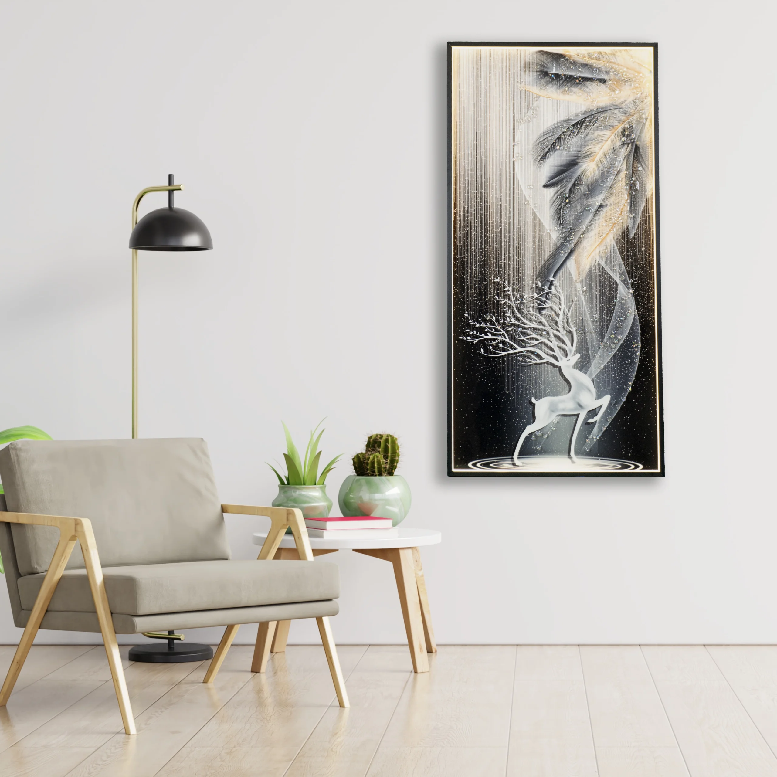 Elevate your living space with this exquisite wall art, featuring a majestic deer with tree-like antlers beneath cascading golden details. The elegant black and gold contrast, enriched with flowing textures, brings luxury and modern sophistication to any interior. Designed with premium framing, diamond fixtures, and crafted with Archelic quality, this artwork offers durability and refined style. The integrated LED lighting with remote control lets you set the perfect mood for any setting.