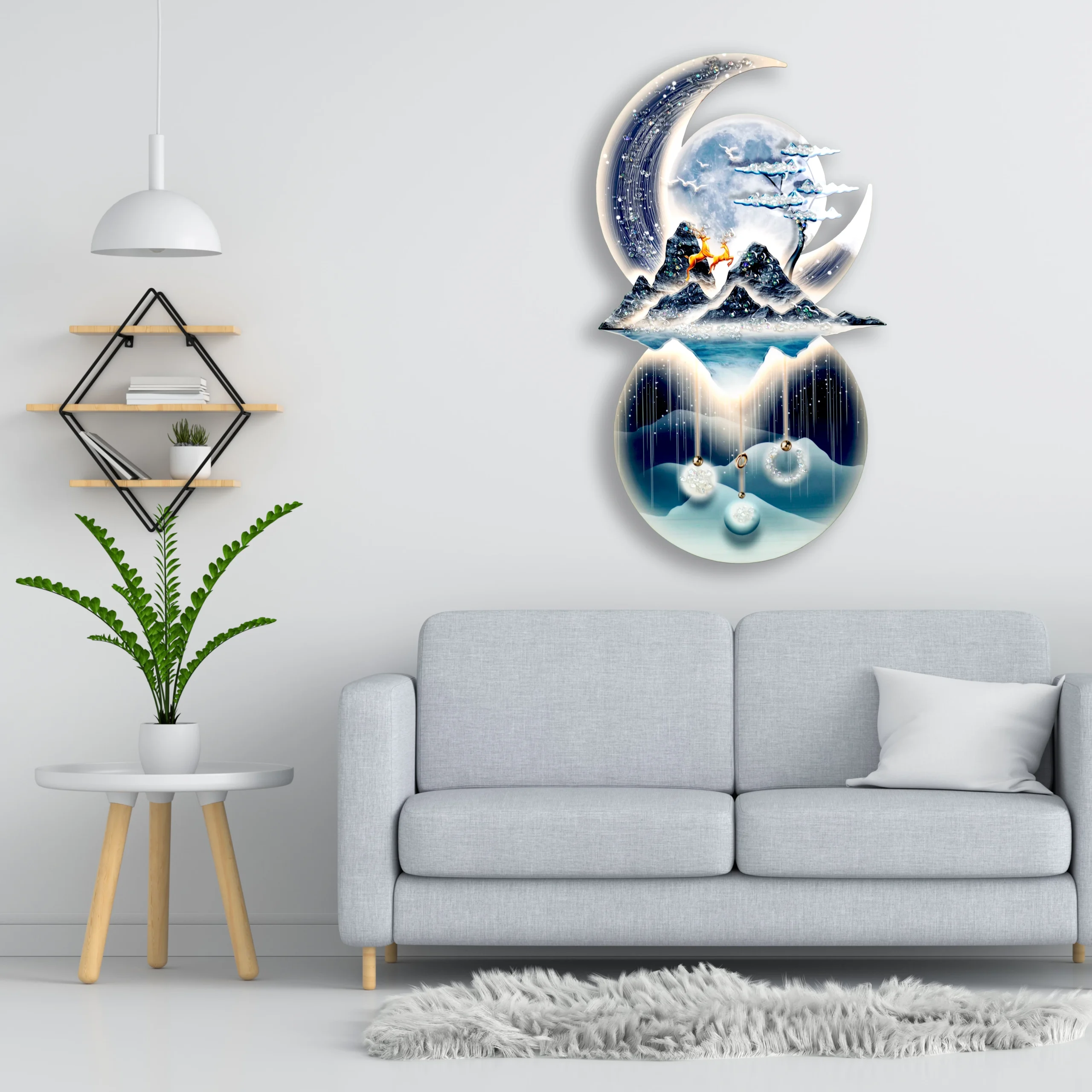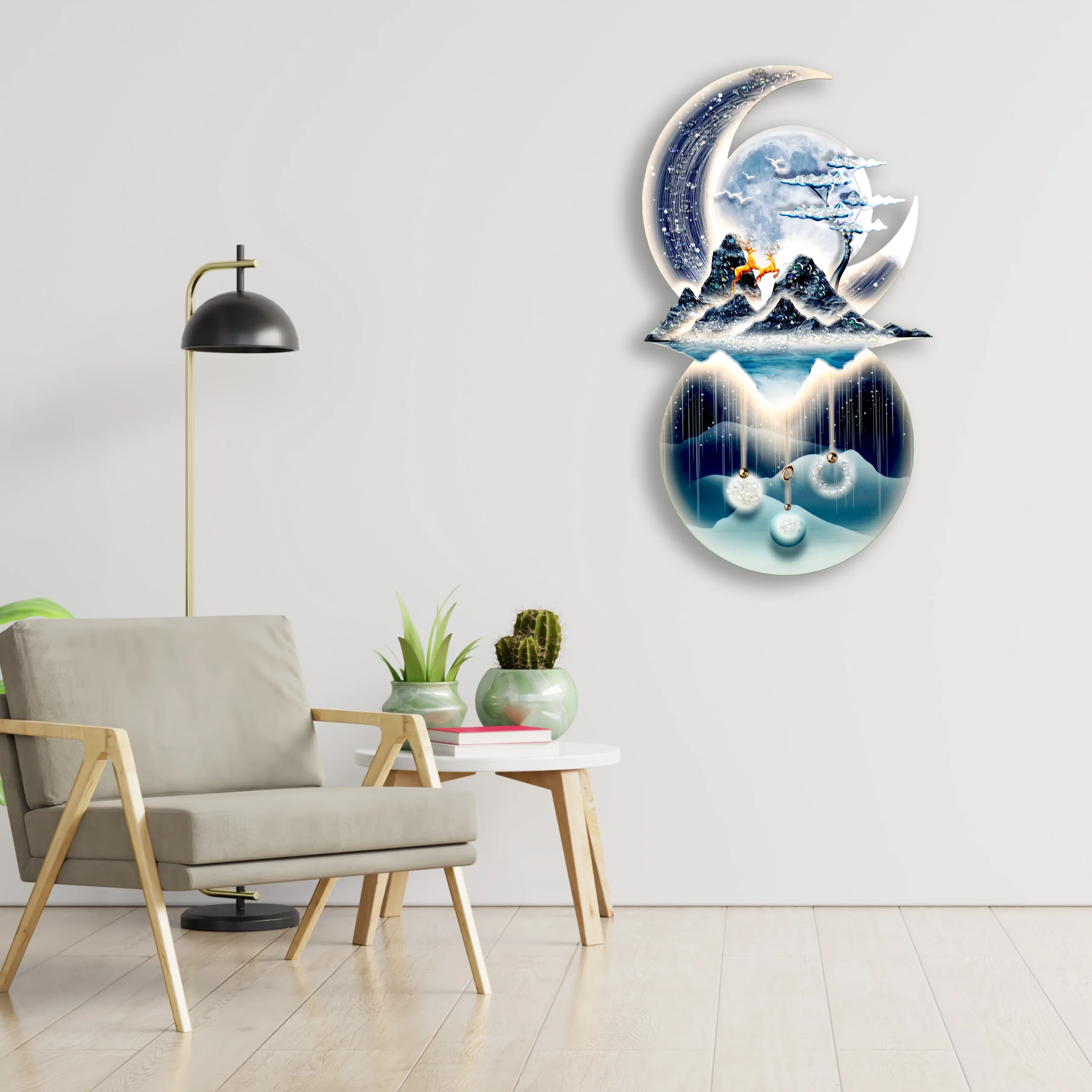 Bring a sense of wonder and calm to your interiors with the Kintu Lunar Dreamscape Wall Art. This stunning design captures an enchanting moonlit mountain scene paired with a dreamlike lower panel that features sparkling orbs and falling stardust, creating a mystical ambiance. The artwork features a refined color blend of midnight blue, icy white, moonlit silver, glowing amber, and soft sky tones, making it an elegant centerpiece for any modern space.