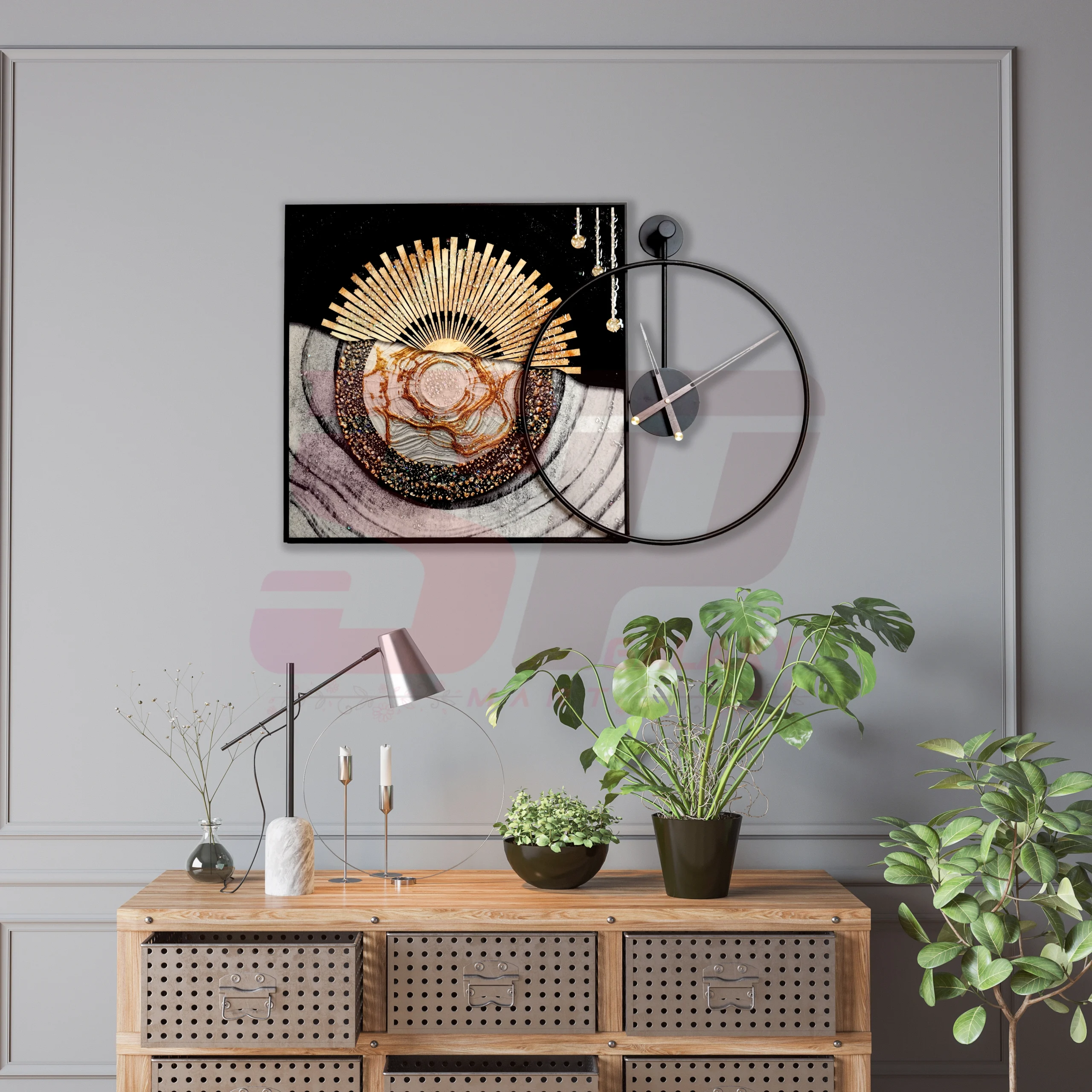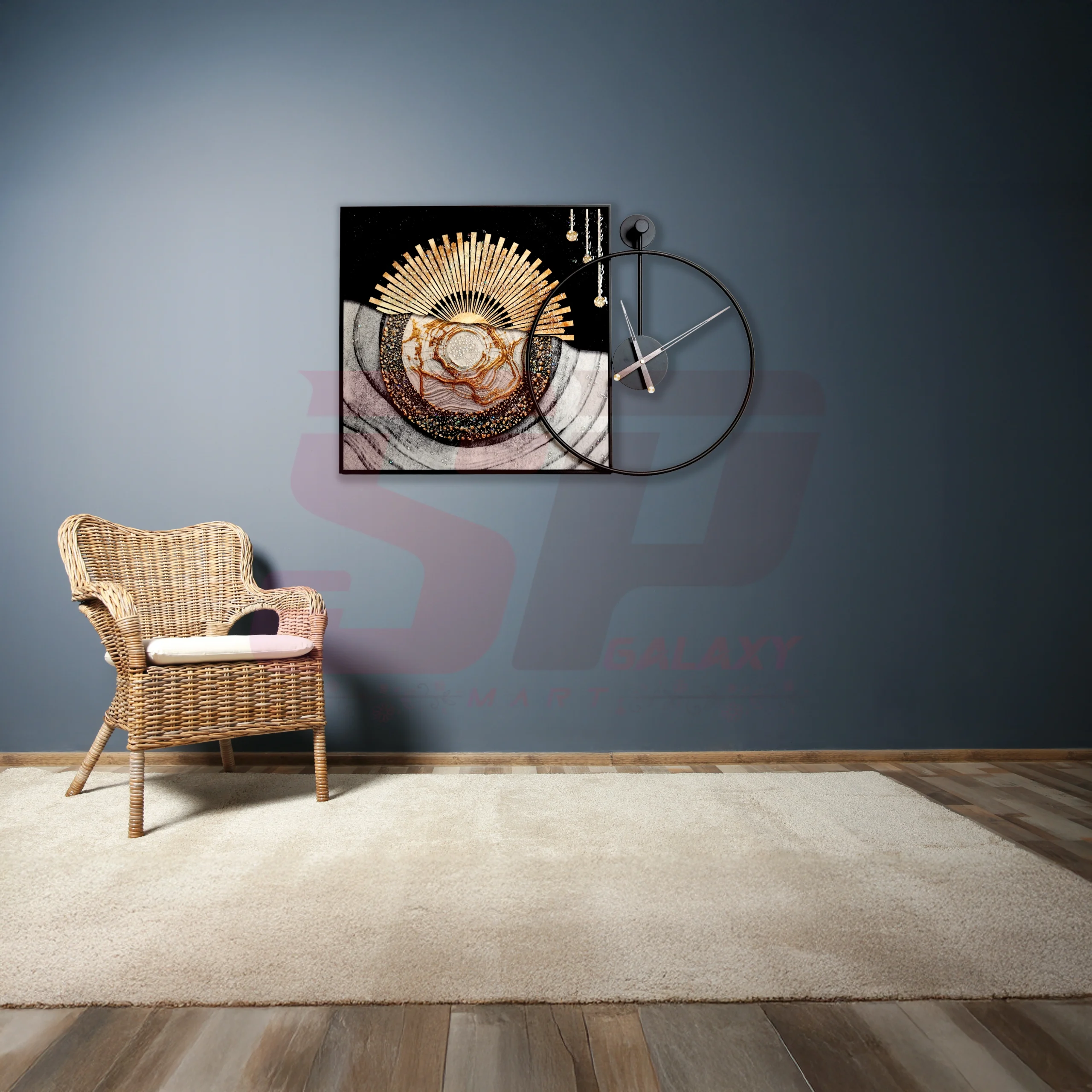 Bring timeless elegance into your home with this Luxury Abstract Wall Art with Modern Metal Clock. Designed with a striking golden sunburst pattern, artistic textures, and a sleek open-frame metal clock, this decor piece perfectly blends art and functionality. The bold black and gold tones add a touch of luxury, making it an ideal centerpiece for living rooms, bedrooms, offices, or entryways.