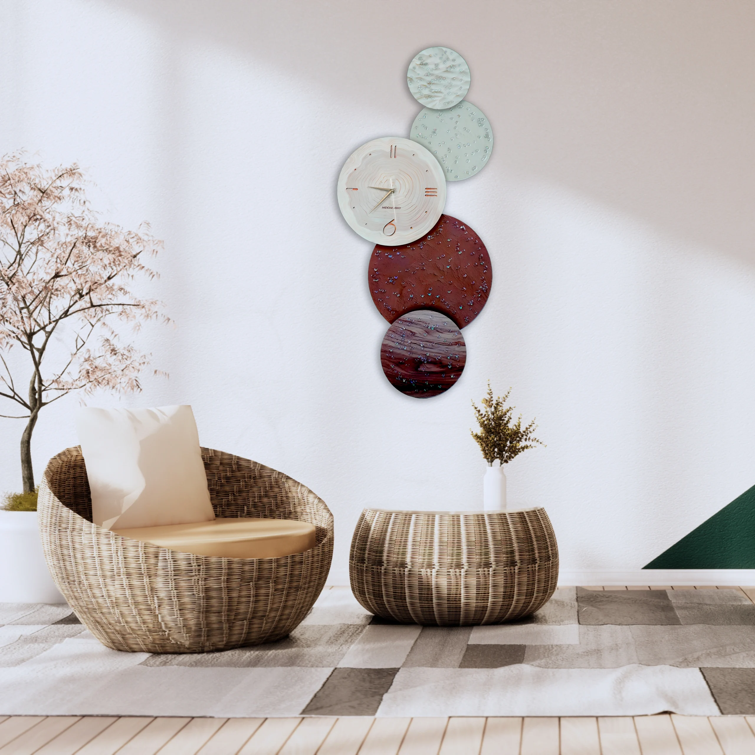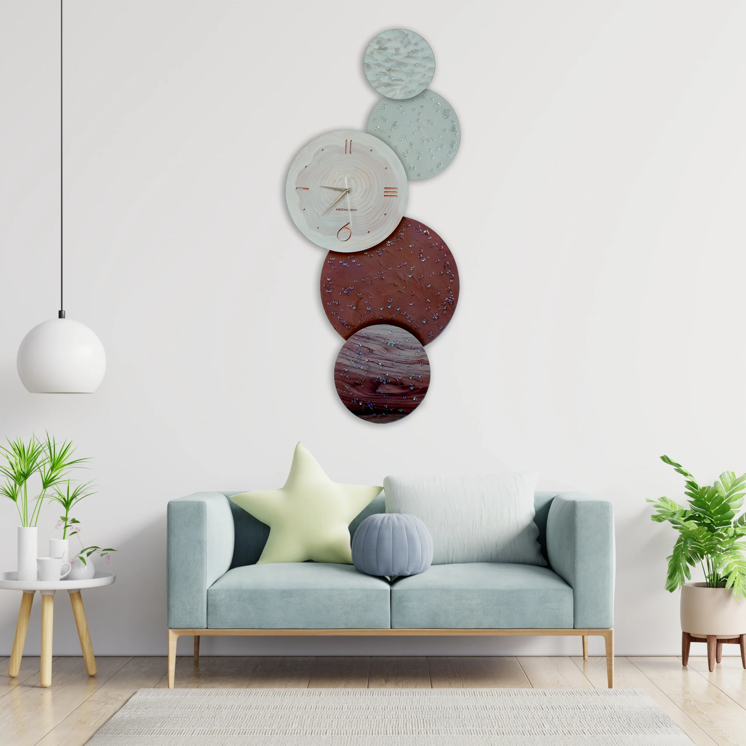 Crafted from high-quality carved porcelain and featuring a built-in acrylic LED warm light, this decorative clock is as practical as it is beautiful. Each porcelain plate is delicately inlaid with shimmering diamonds, adding a refined sparkle and luxury feel to your space. The unique design features five circular elements in a cascading arrangement, with the central circle displaying a sleek clock with elegant Roman numerals.