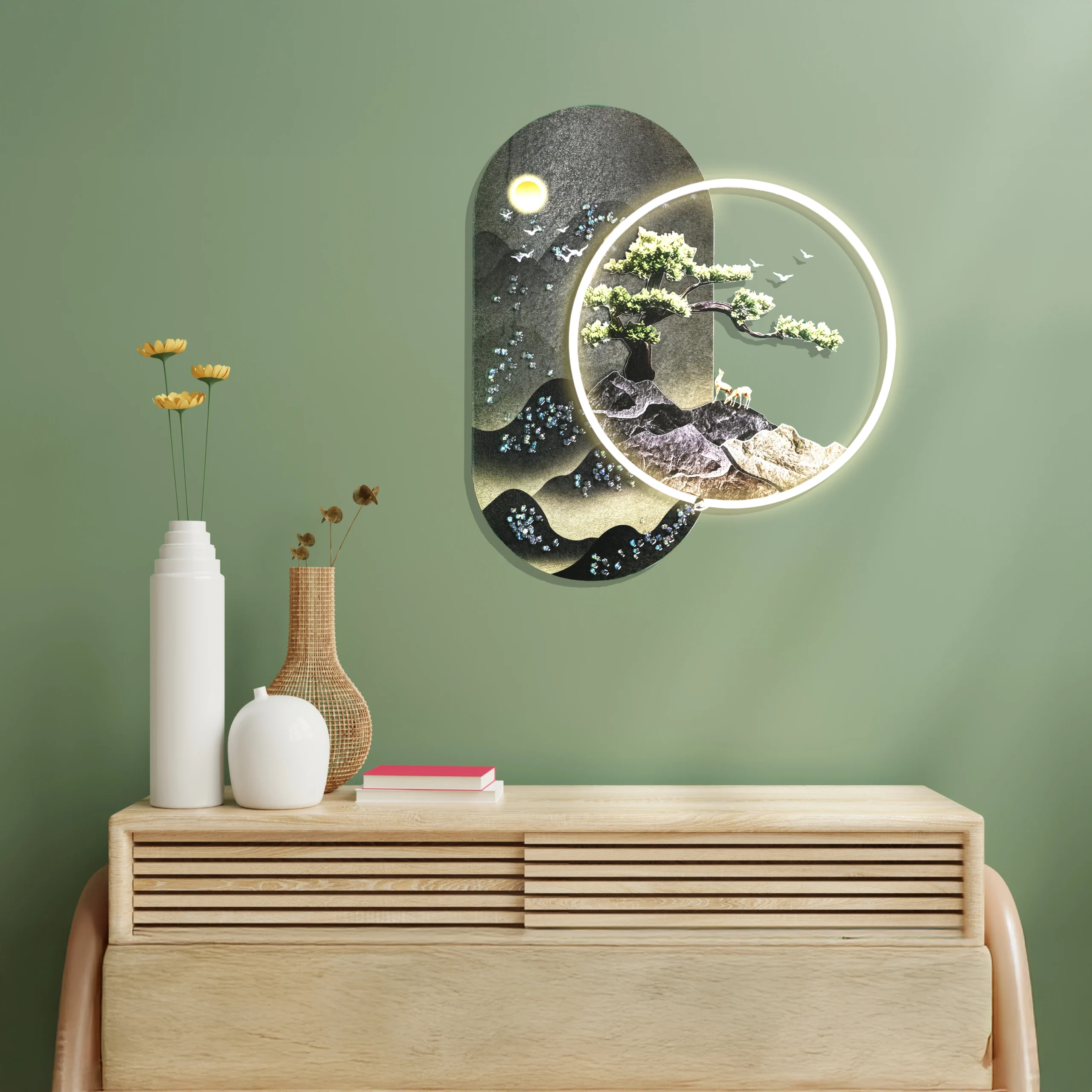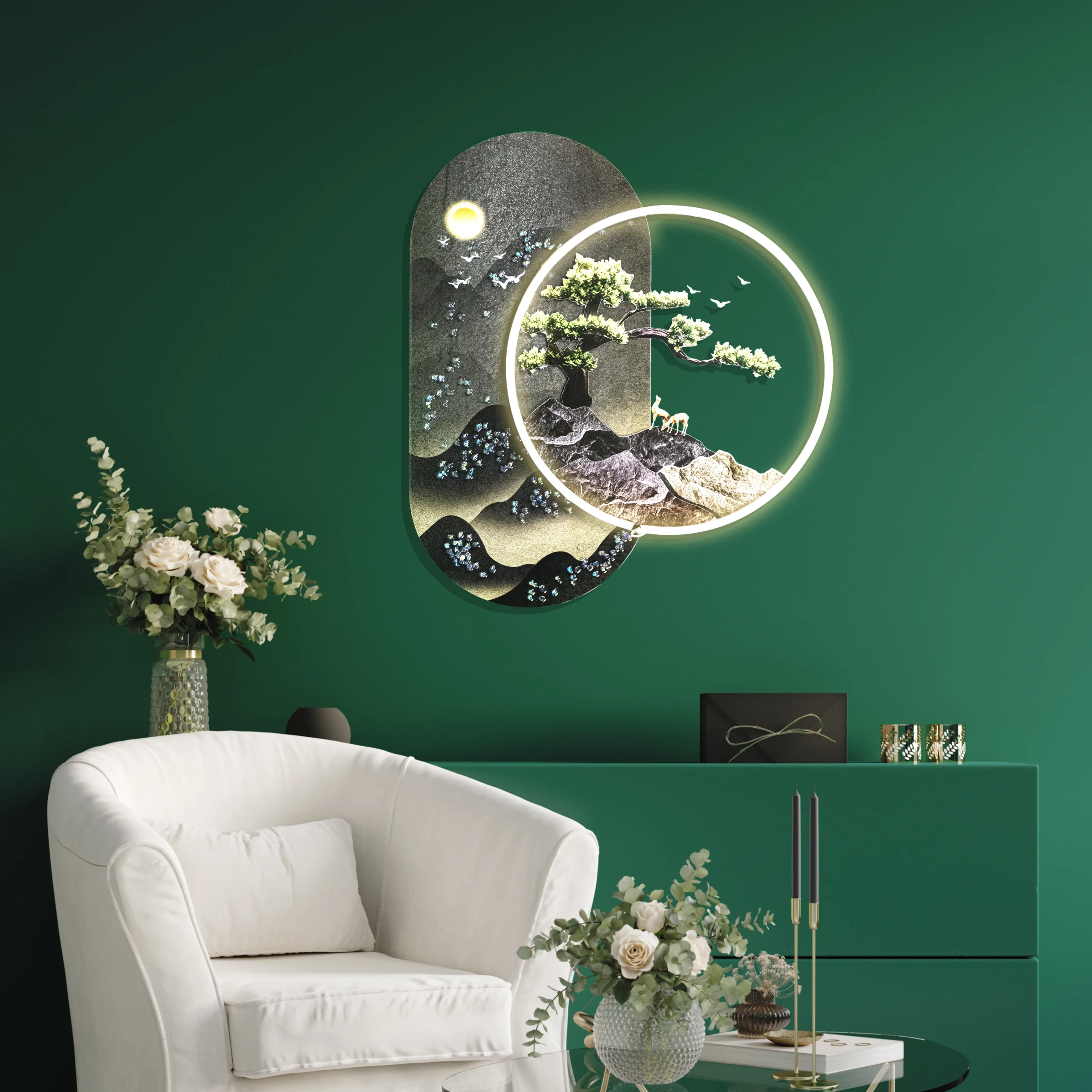 Infuse your living space with peaceful charm through this exquisite wall decor piece, beautifully designed to balance artistry and ambiance. The artwork presents a captivating landscape with flowing hills, a luminous tree, and a graceful deer — all set against a contrasting backdrop in hues of deep charcoal, earthy beige, moss green, and soft ivory.