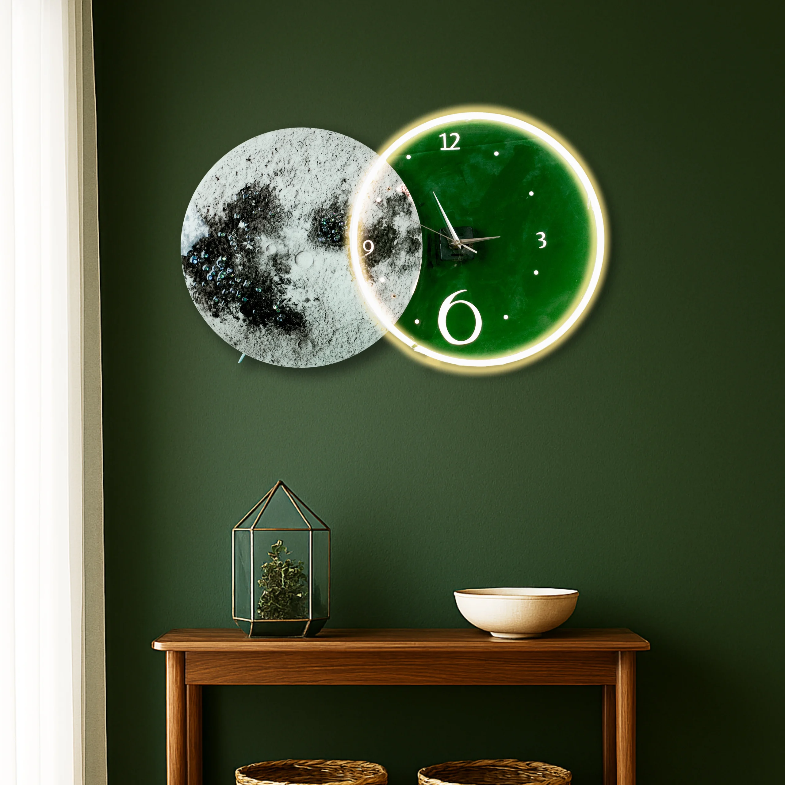 The right side features a deep green carved porcelain clock face, surrounded by a radiant acrylic LED warm light ring, ensuring visibility and aesthetic appeal even in low-light settings. The left panel replicates the lunar surface with detailed textures and diamond inlay accents that subtly shimmer — creating a bold yet calming composition.