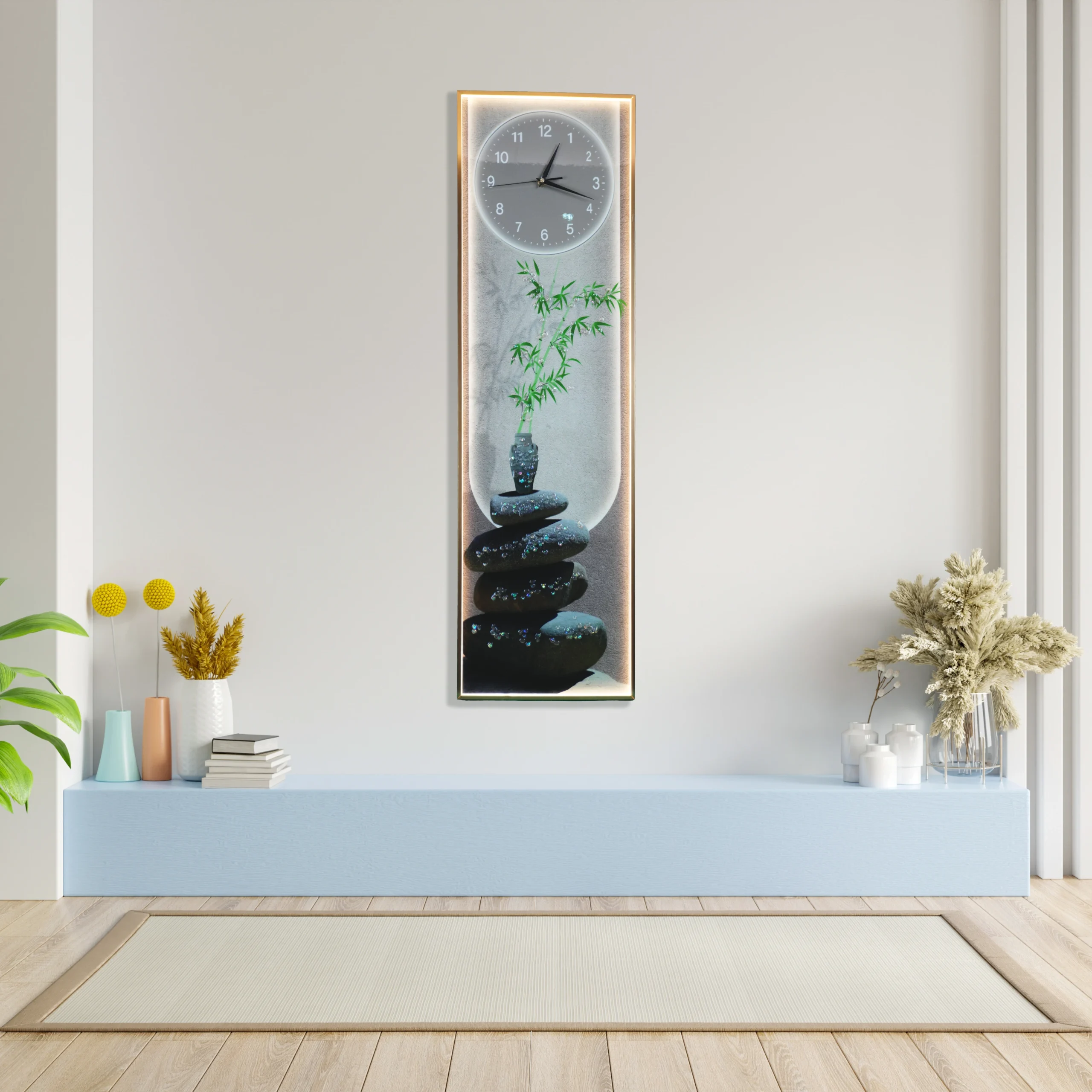 Create a serene and sophisticated atmosphere in your home with the Tranquil Zen Bamboo Wall Clock with Porcelain & LED Accents. This vertical wall décor blends artistic beauty with everyday function, featuring a minimalist stacked stone arrangement topped with a bamboo plant — symbolizing balance and calm.