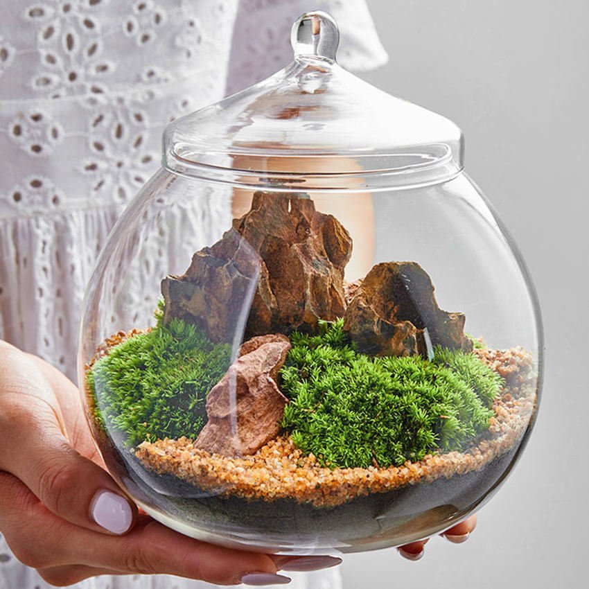 Discover a living piece of art with the Verdura Dome Terrarium, where nature meets elegance in a perfectly balanced glass habitat. This exquisite handcrafted miniature landscape captures the serene beauty of moss, natural rocks, and earthy textures inside a crystal-clear, lidded glass orb.
