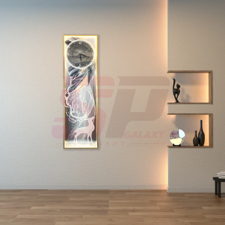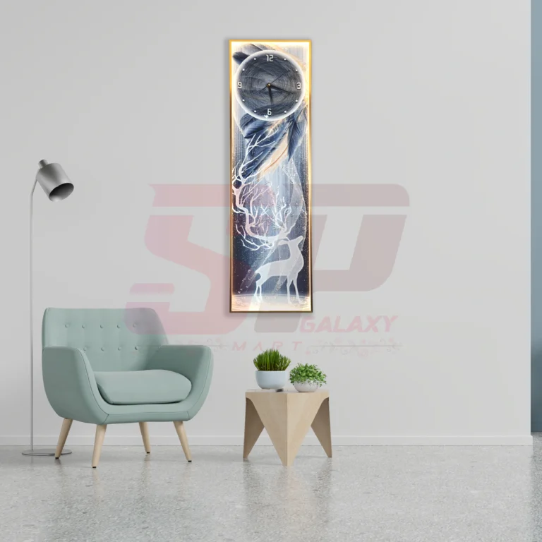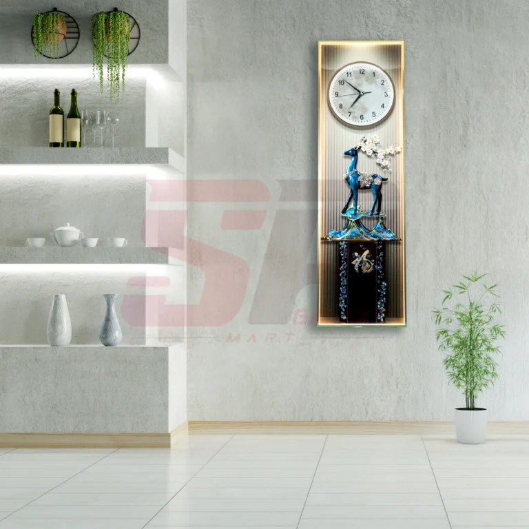 Luxurious wall clock with sculpted blue deer and LED-lit floral design. A 40×80cm vertical masterpiece that blends timekeeping with fine decor.