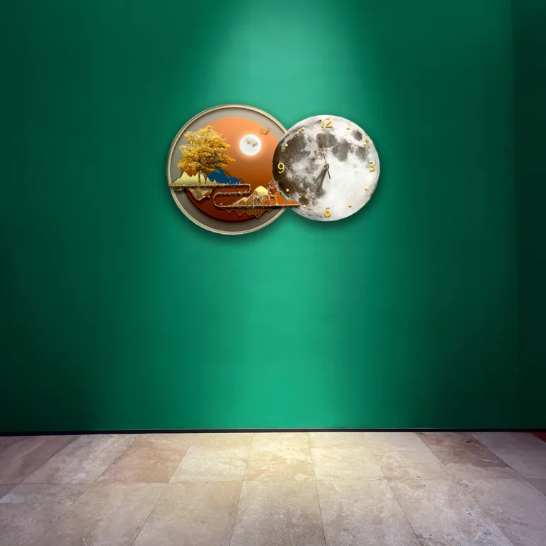 Artistic wall clock featuring Aluminum, Diamond-inlaid Porcelain, and Acrylic with integrated LED warm light. A luxurious nature-inspired décor piece for modern interiors.